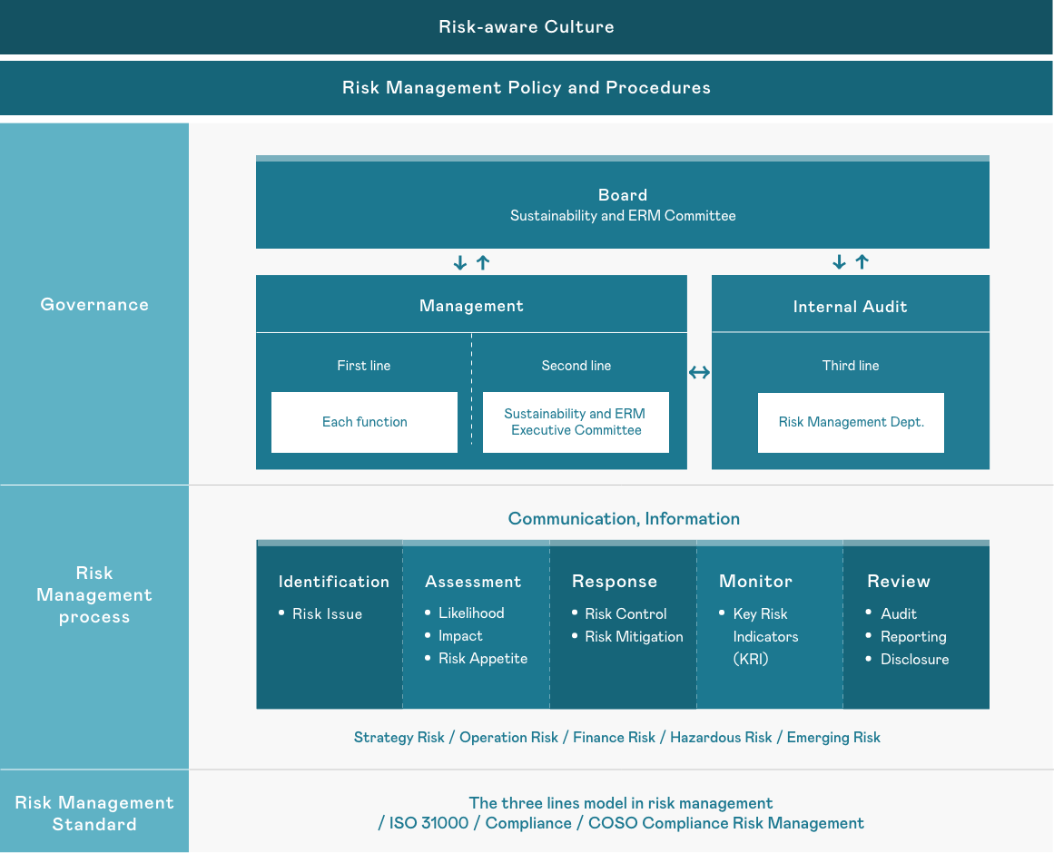 The Company follows international risk management guidelines to establish the 'Risk Management Policy and Procedures' as the highest guiding principle for risk management. We strengthen and enhance the internal system architecture, and promote the resilience of our sustainable business operations.