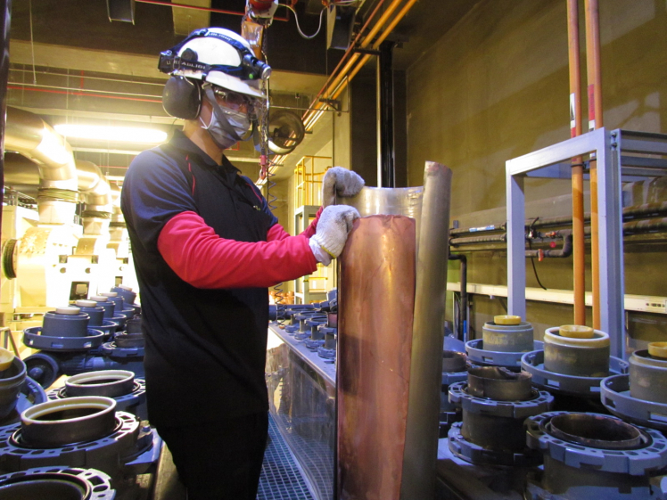 PT视讯(中国区)官网将废弃物转化成有效的工业或民生原物料,图为废铜液淬炼后再制成纯度极高的铜管