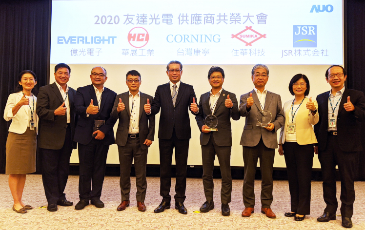達肯定供應商永續經營的優異表現,頒發永續夥伴、環境友善及社會共融等獎項。(左三:億光副總經理李家豪、左四:華展執行副總黃啟業、中:台灣康寧總經理曾崇凱、右四:住華總經理暨營運長枝松邦茂、右三:JSR 董事長根本宏明)